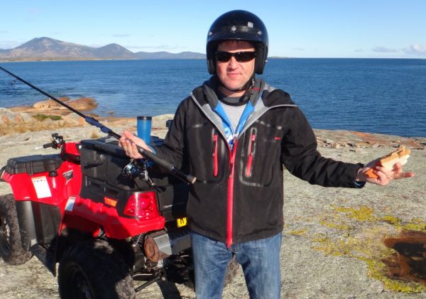 What-doesn't everyone fish talk eat and ride at the same time. Rob on the Flinders Island Quad Bike Tour